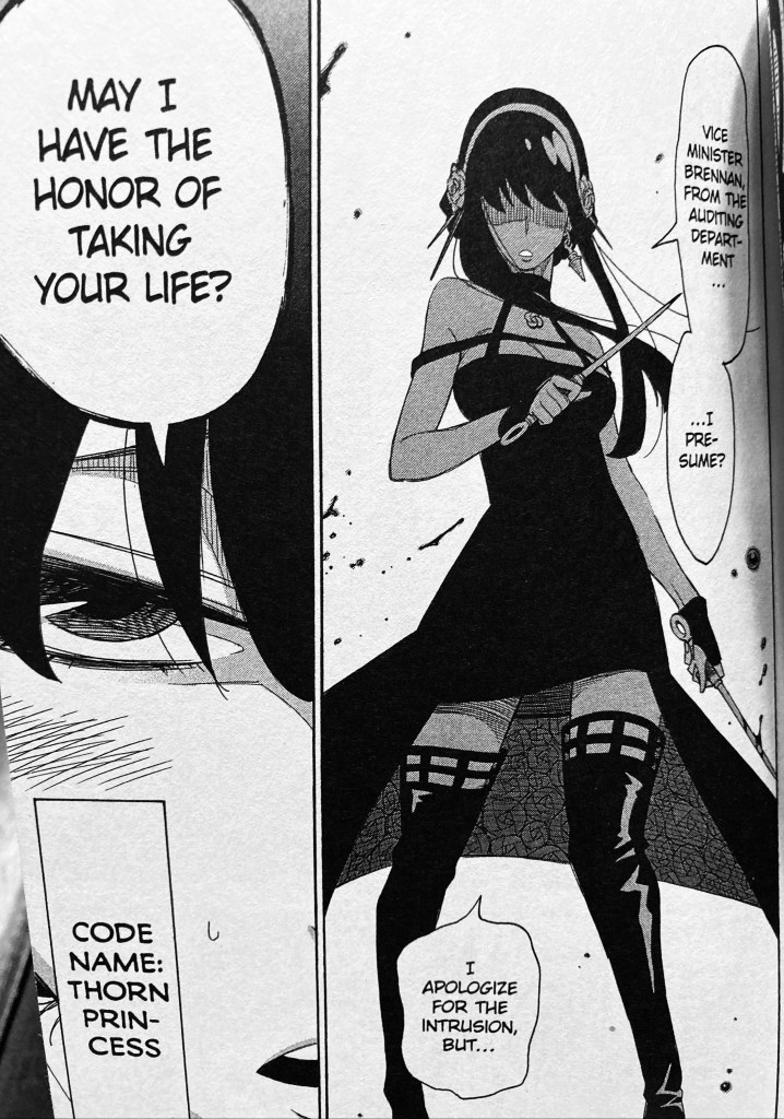 Now that a child is procured all that’s left is acquiring a wife. Enter Yor, a beautiful 27-year-old woman who works for the government. While she may appear to be quiet, her ability to work not just for herself but for others leads Twilight into asking for her hand in marriage. Yet, she has something to gain from this proposal as well, for you see Yor is an assassin. Many people are suspect of someone at her age being single, and to avoid people looking into her she chooses to play along without Twilight knowing her real profession.